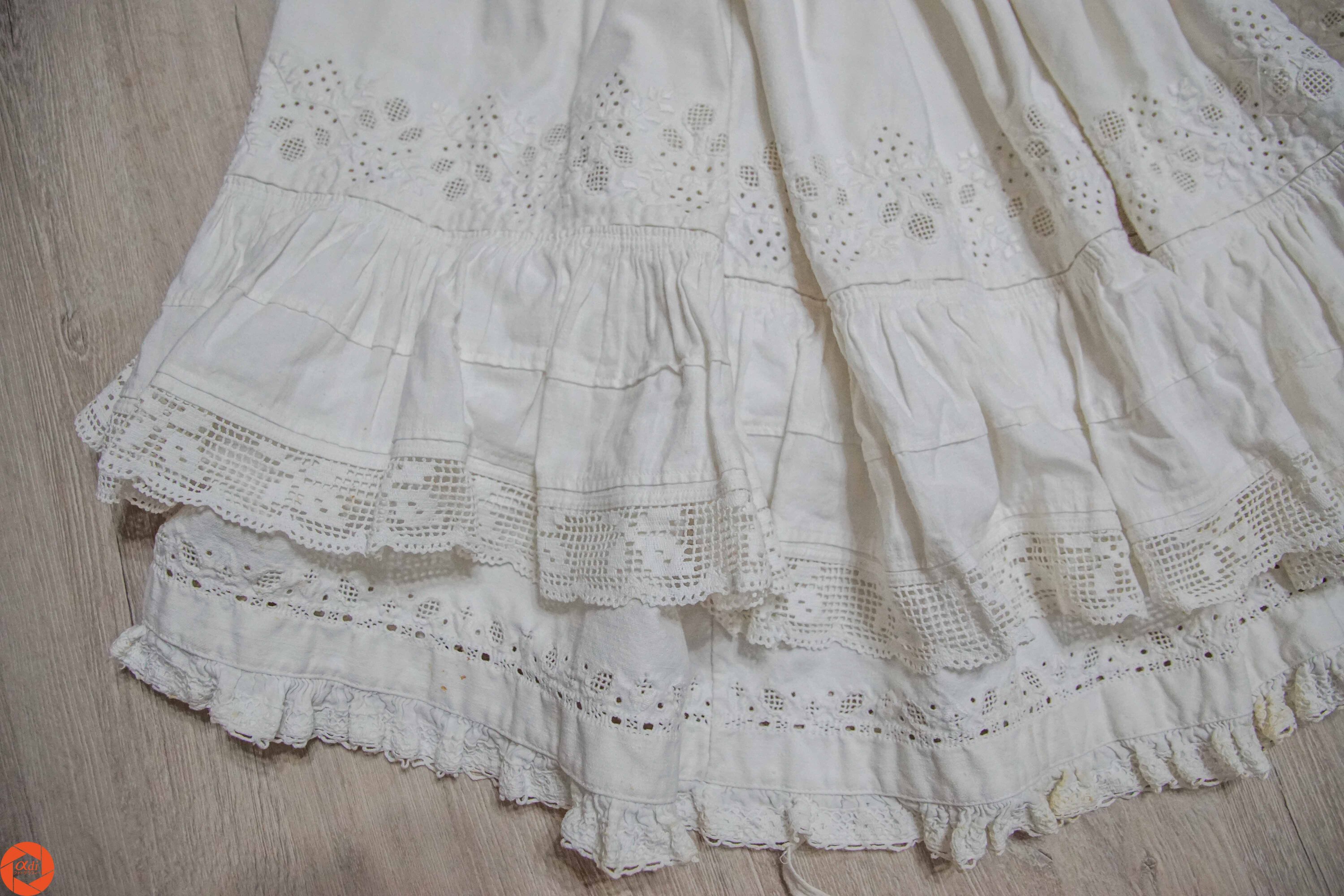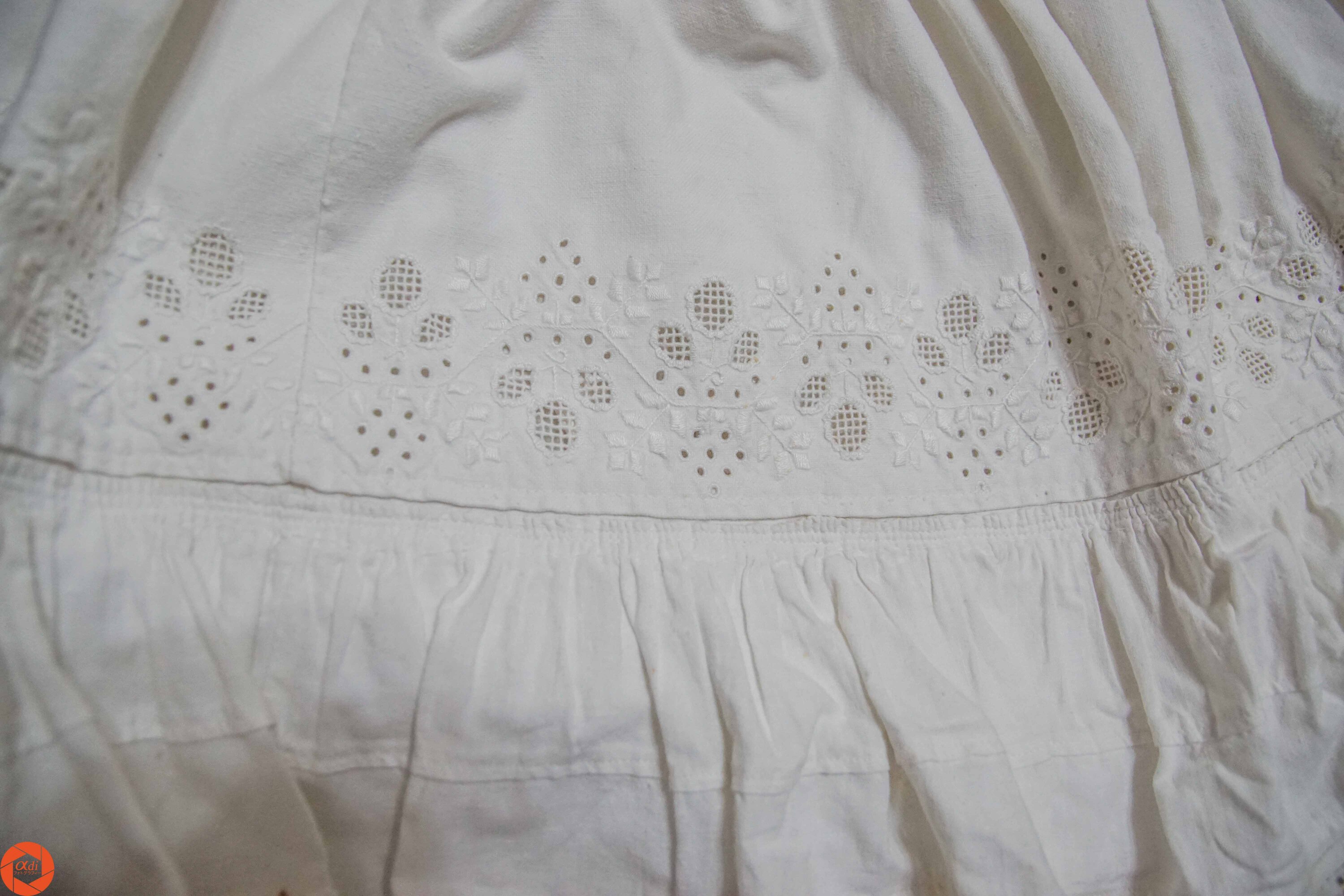 Aceste poale sunt din zona depresiunii Beiușului. Au o vechime de aproximativ 90 – 100 ani. Doamna Ecaterina ne povestește cu mândrie că au aparținut mamei sale. Sunt purtate cu mândrie și astăzi, atât la sărbători, cât și la dansuri populare. Specific zonei Beiușului este lungimea fodrei (mai lungă decât în alte zone) și ornamentația mai bogată. Una din cele mai spectaculoase ornamentații este broderia spartă, cu fir tăiat, “fir în dinte”, după cum se spunea în această zona. Materialul din care sunt confecționate este pânza de cânepă țesută în războiul de țesut.