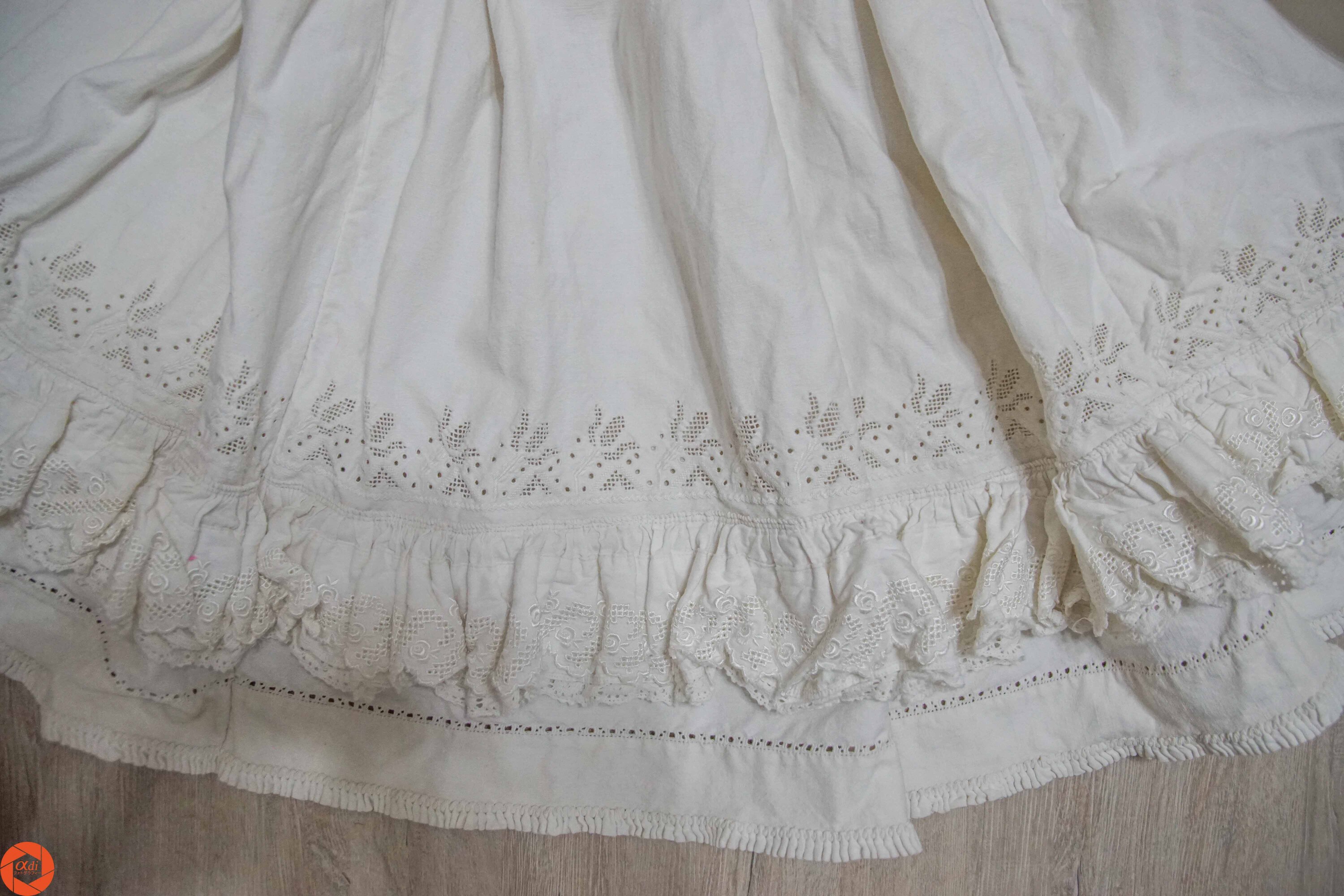 Aceste poale din cânepă au o vechime de peste 100 de ani. Modelul broderiei este în formă de lalea și a fost făcut în tehnica firului tăiat. Se poate observa că la aceste poale sunt prezente modele sus pe talie, asta datorită faptului că se purtau mai ales vara, fără cojoc și, pentru a fi cât mai frumoase, erau ornamentate și pe talie.