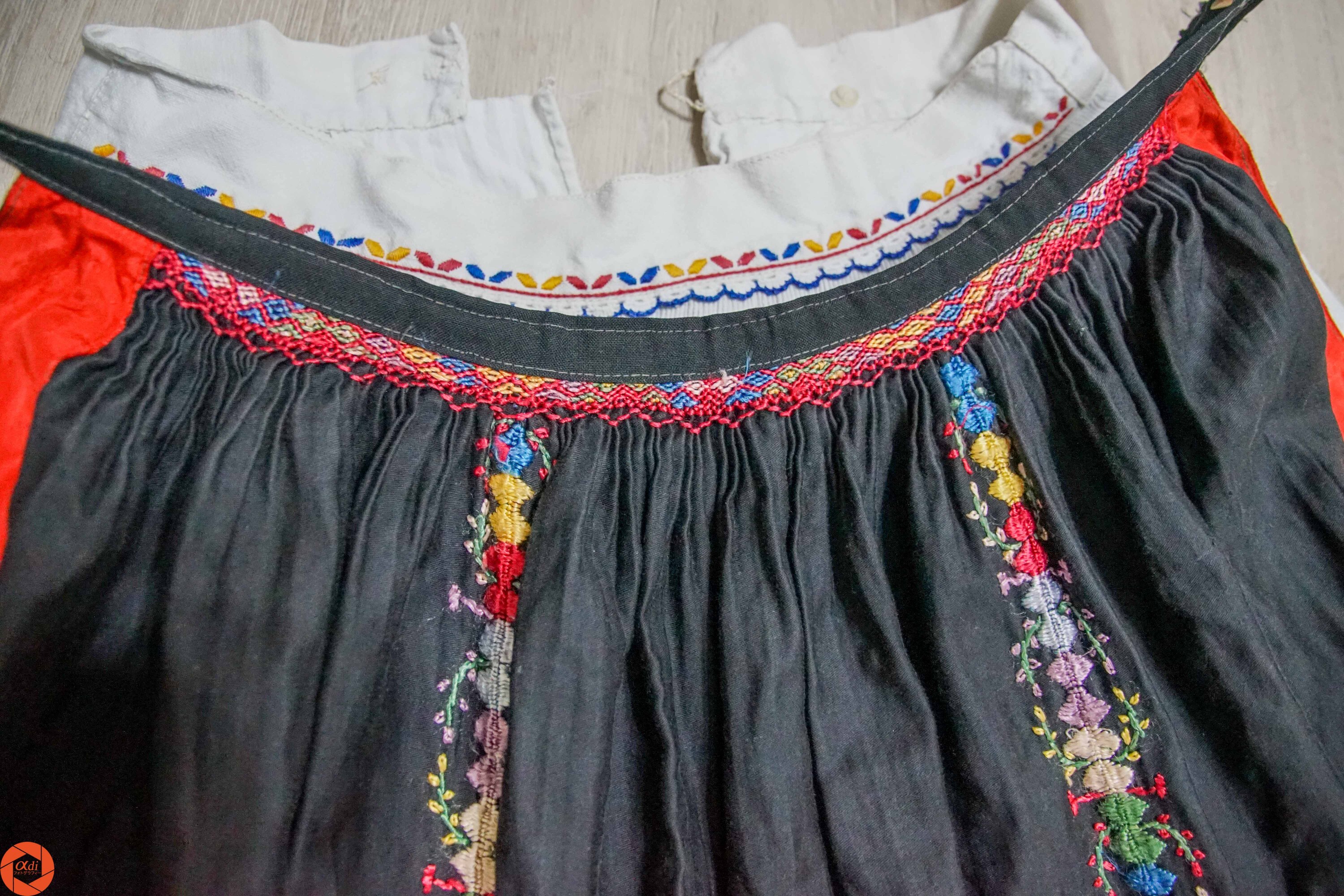 Acesta este un șorț, zadie, din zona Voievozi. Broderia este realizată cu fir de mătase. Are o vechime de peste 100 de ani şi face parte din colecţia familiei doamnei Ecaterina.