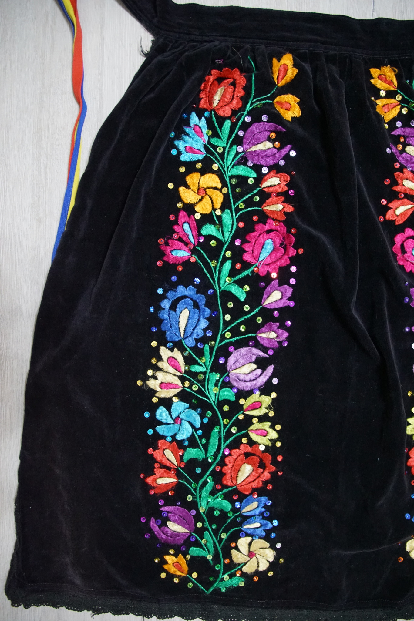 Această zadie este din zona Aleșdului. Are aproximativ 60 de ani. Este brodată cu fir de mătase și paiete pe material de catifea.