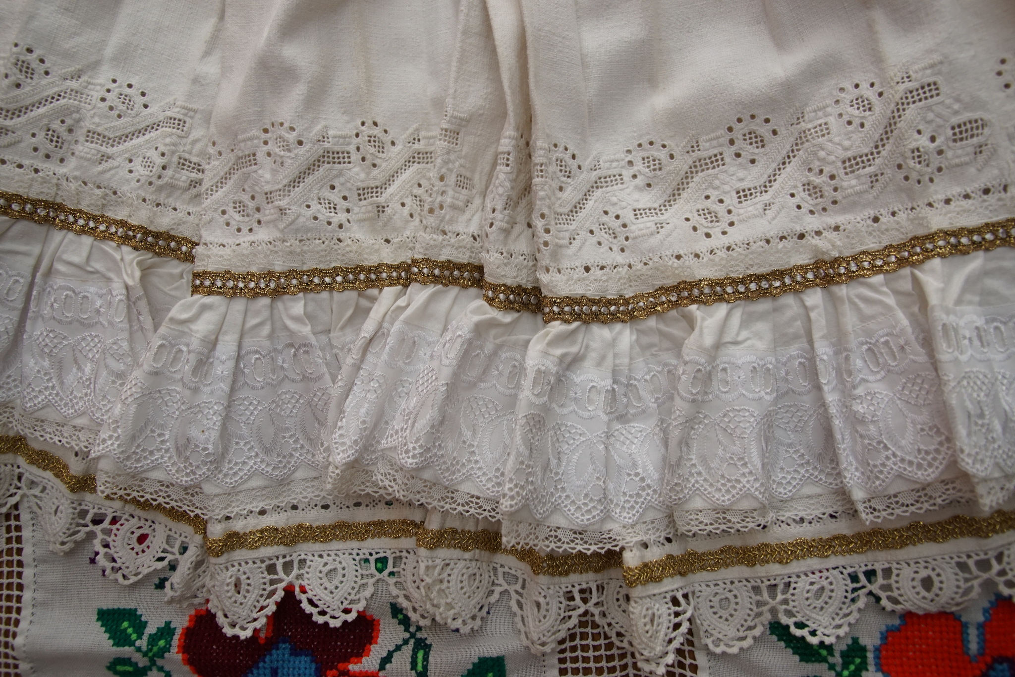 Aceste poale au fost cusute și croite de doamna Ecaterina Zoţ în tinerețe. Sunt specifice zonelor Albeşti și Pomezeu. Au o vechime de aproximativ 65 de ani, însă pânza din care au fost croite este mai veche, de peste 100 de ani, fiind țesută de mama dânsei din cânepă cu misir (bumbac). Sunt împodobite cu fir auriu, cu cipcă făcută de mână (dantela) și cu broderie cu fir tăiat. Broderia a fost făcută de mama dânsei.
