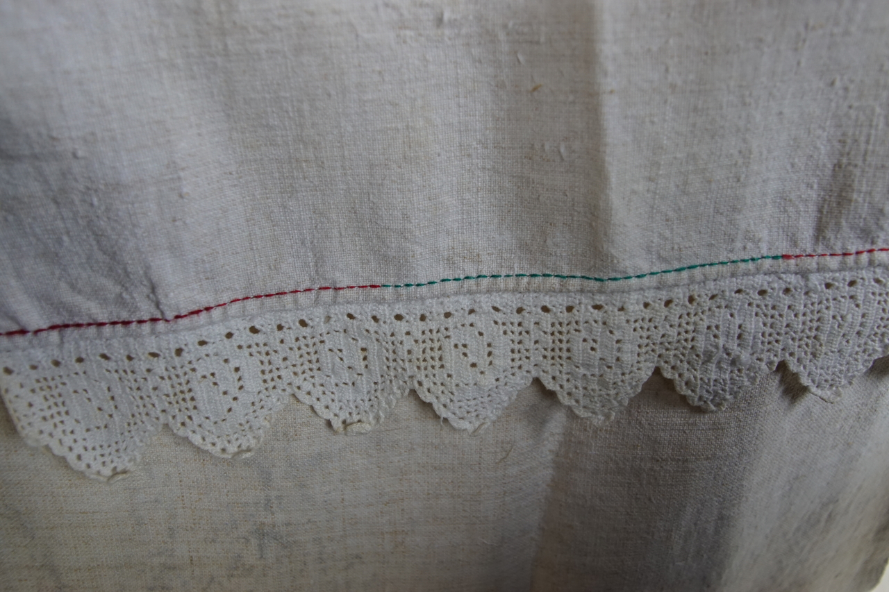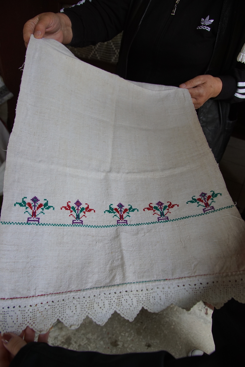 Acesta este un ștergar din zona Damiș, Bratca, vechi de peste 100 de ani. Este țesut din pânză de cânepă țesută în casă și ornamentat cu broderie de mână și cipcă (dantelă).