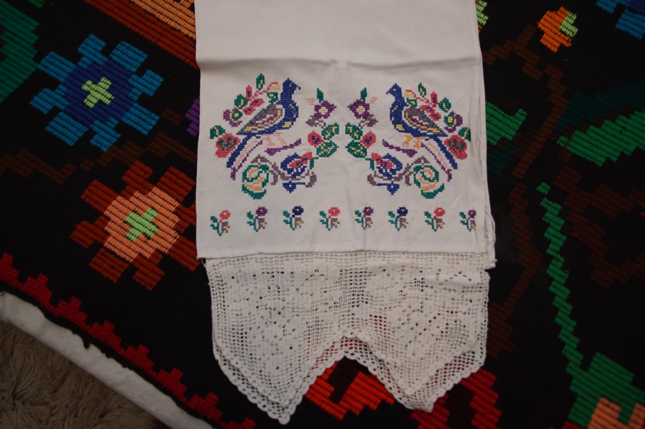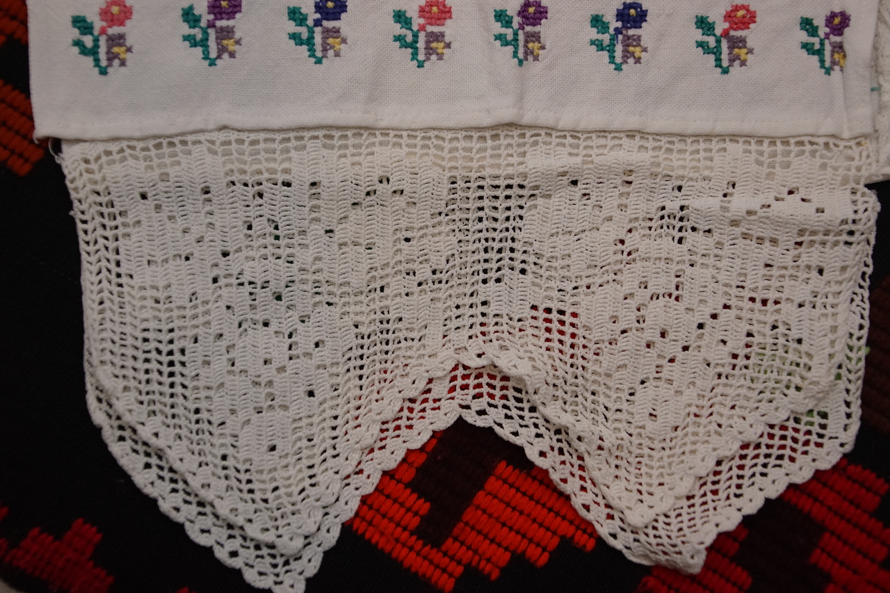 Acesta este un ștergar din zona Damiș, Bratca, vechi de aproximativ 60 de ani. Este confecționat din pămucă, adică din pânză de bumbac țesută în casă la războiul de țesut. În partea de jos este decorat cu cipcă, dantelă făcută în casă. Atât cipca, cât și broderia sunt spectaculoase.