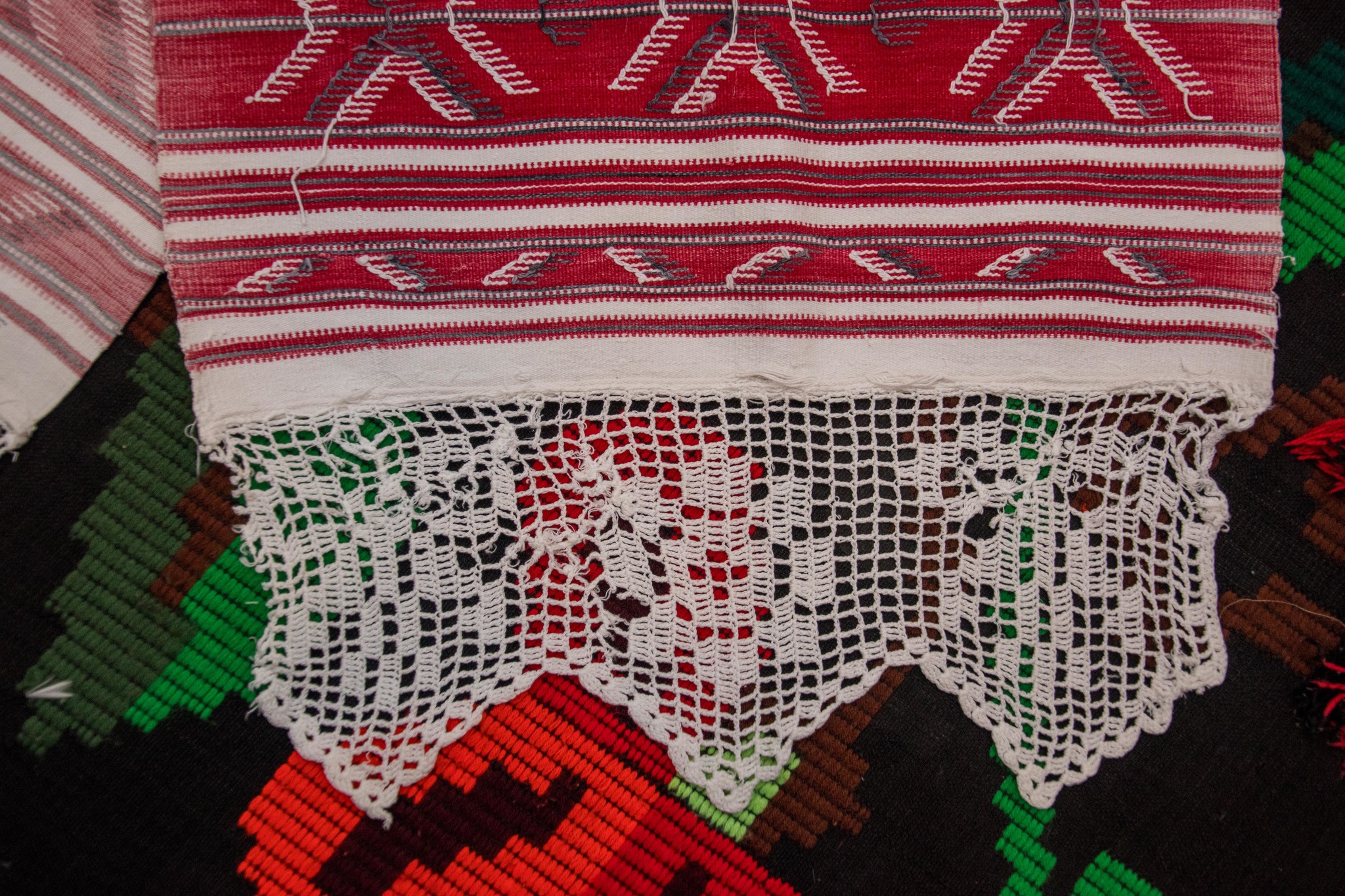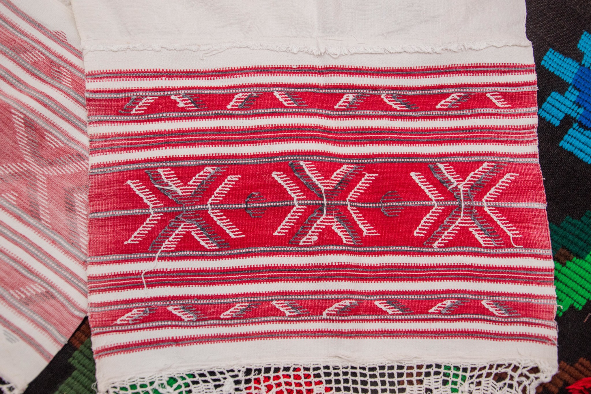 Acesta este un ștergar din zona Damiș, Bratca, vechi de aproximativ 100 de ani. Este confecționat din pămucă, adică din pânză de bumbac țesută în casă la războiul de țesut. Modelul este țesut integral în războiul de țesut odată cu pânza. În partea de jos este decorat cu cipcă, dantelă făcută în casă. Cipca a fost refăcută, deoarece cea originală s-a destrămat.