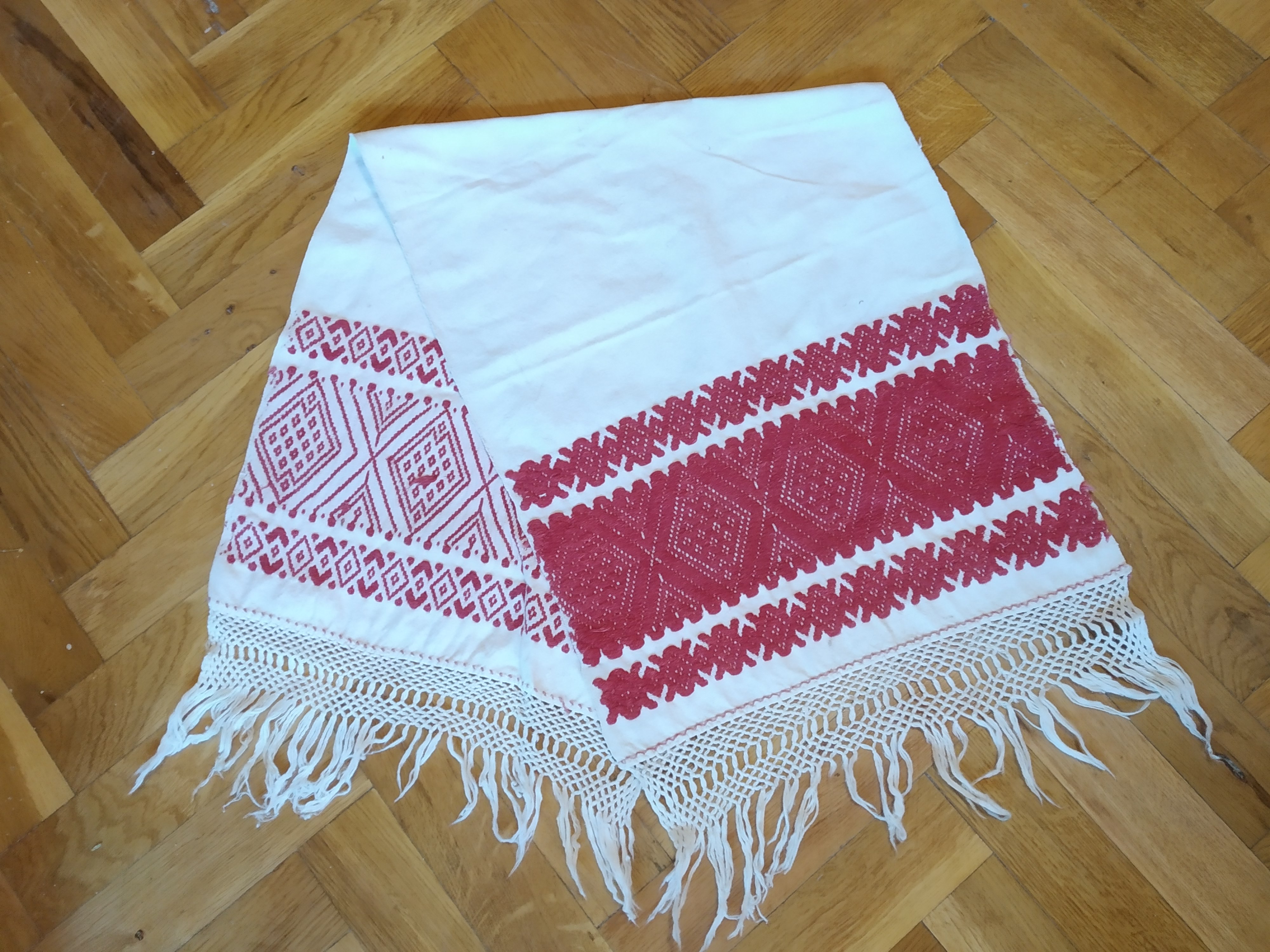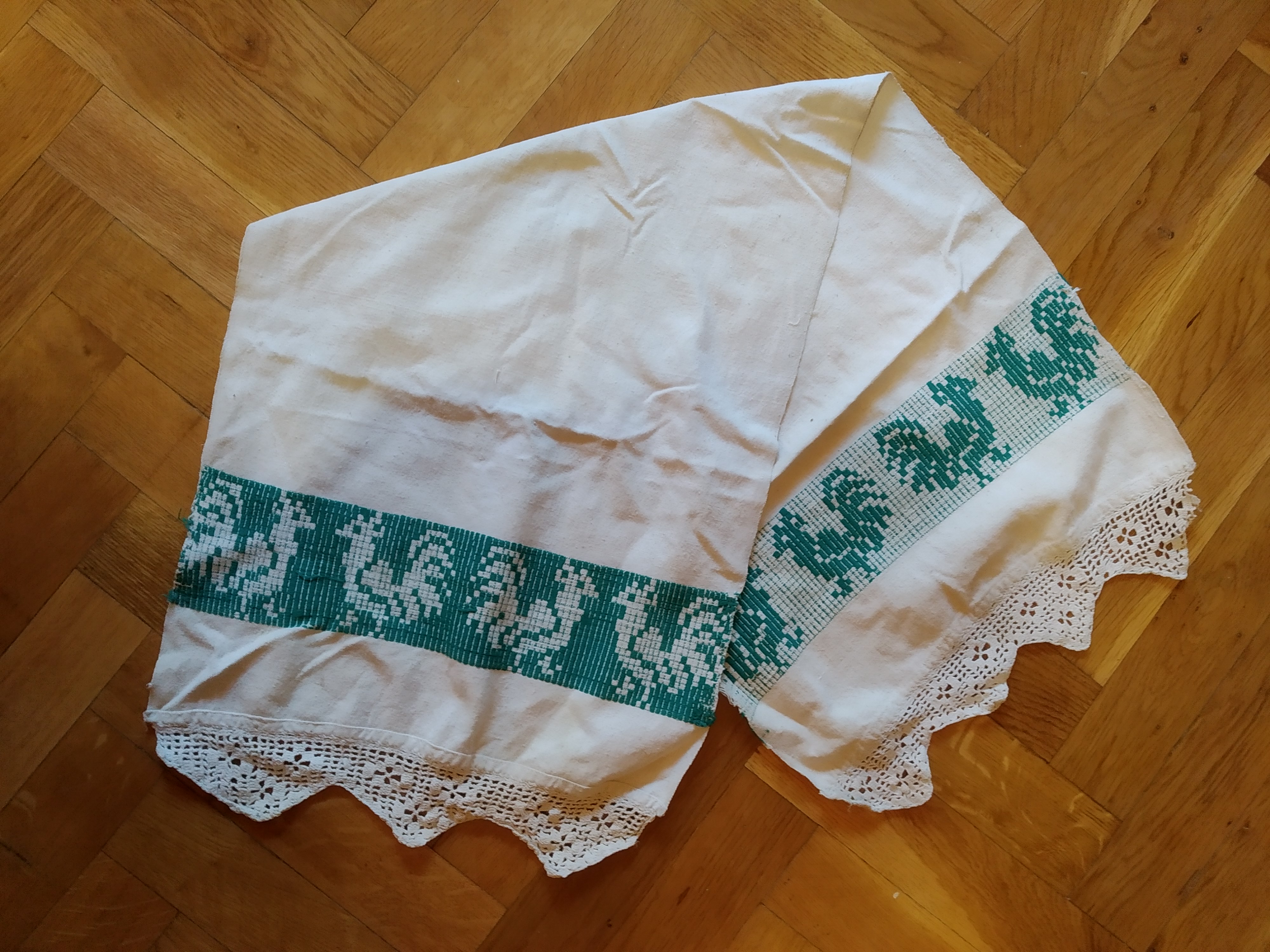 Acest set de ștergare sunt moștenite de la bunica și străbunica din partea mamei mele. Sunt din zona Aleșdului, sat Peștera. Au fost țesute în războiul de țesut din fire de cânepă, iar atât modelul cu cocoși, cât și cel geometric au fost țesute integral odată cu pânza. Cele cu cocoși au o vechime de peste 100 de ani, la fel și cipca, dantela de la bordura ștergarelor. Cel cu motive geometrice are în jur de 40 de ani și a fost țesut de bunica mea. Ca și ornamentație mai are prezentă și cusătura bob de orez sau pupi, cum se mai spune prin partea locului. Delia Şandro